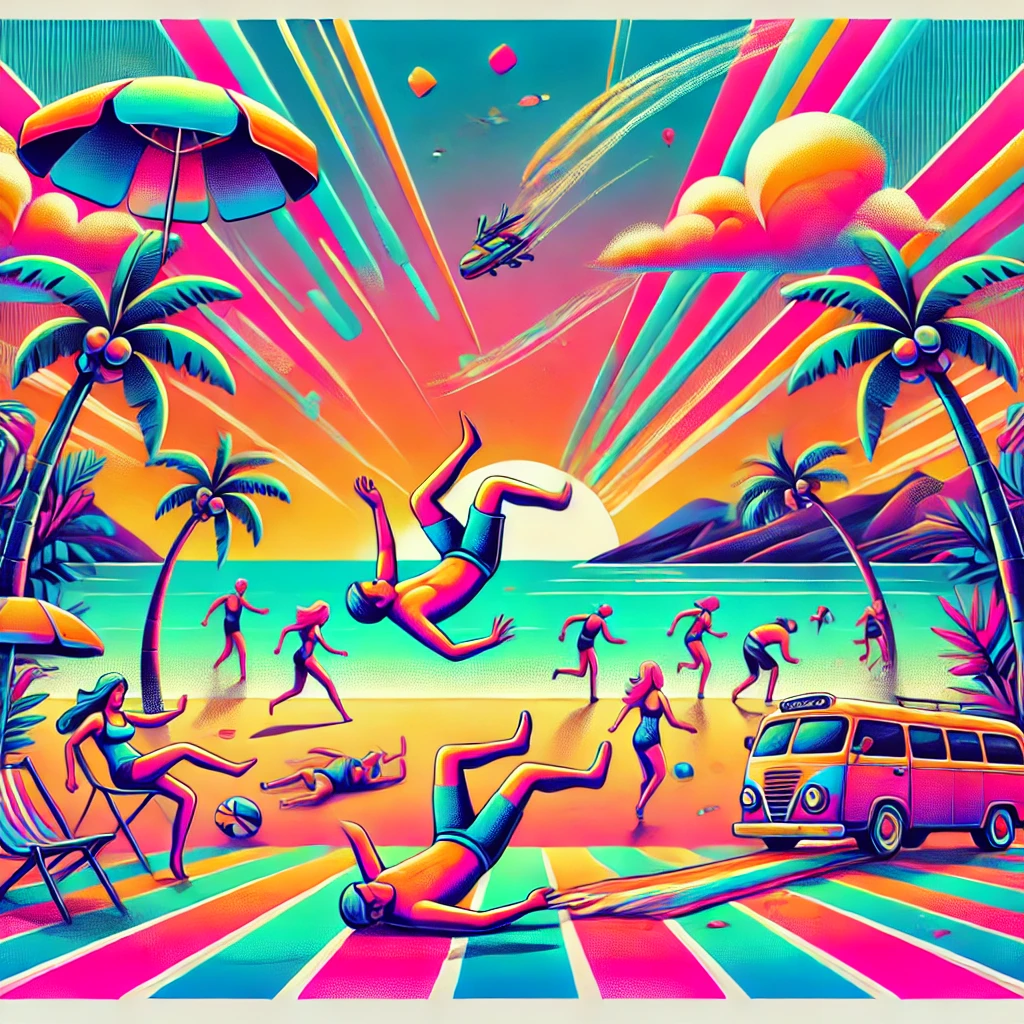 A colorful scene set on a paradise island, with people humorously slipping and falling in slapstick-style accidents, featuring a vibrant and abstract cyberpunk design.