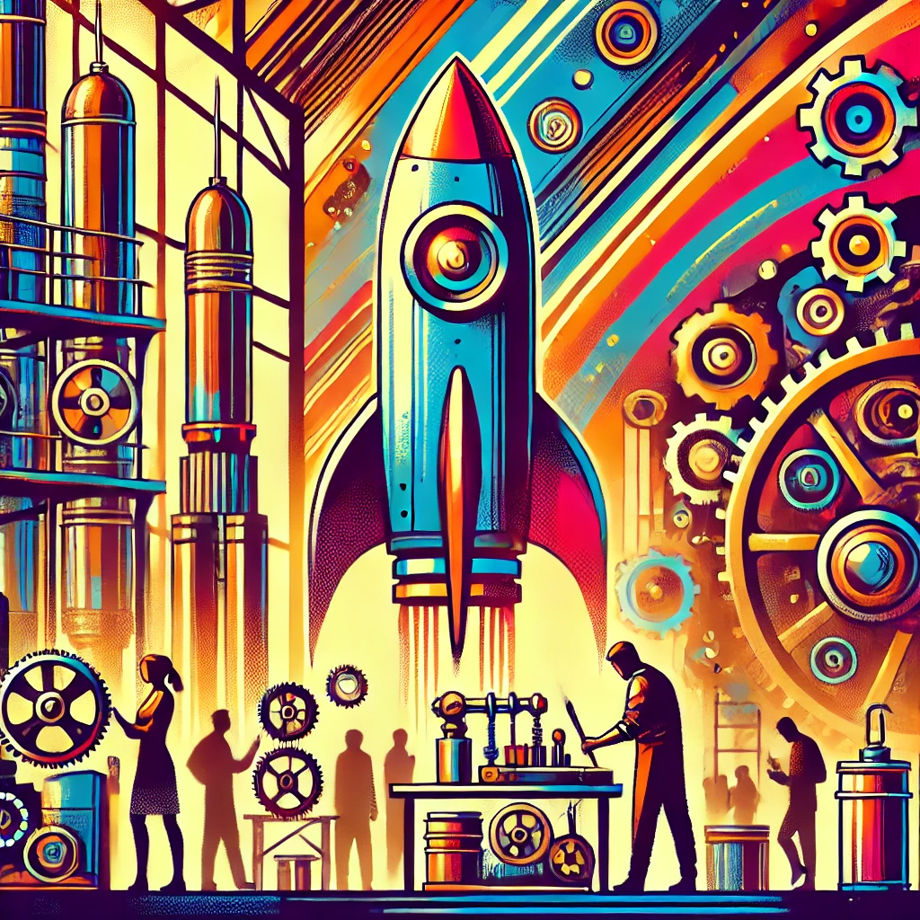 Steampunk-themed image with people working seriously in a vibrant factory, featuring a rocket in the background.