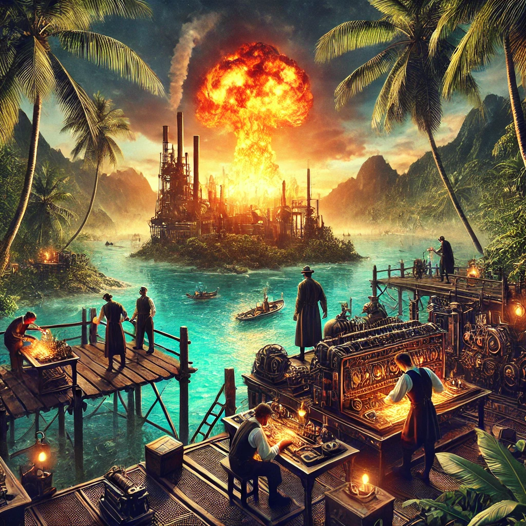Steampunk machinery being operated by workers on a vibrant paradise island with a subtle explosion in the distance.