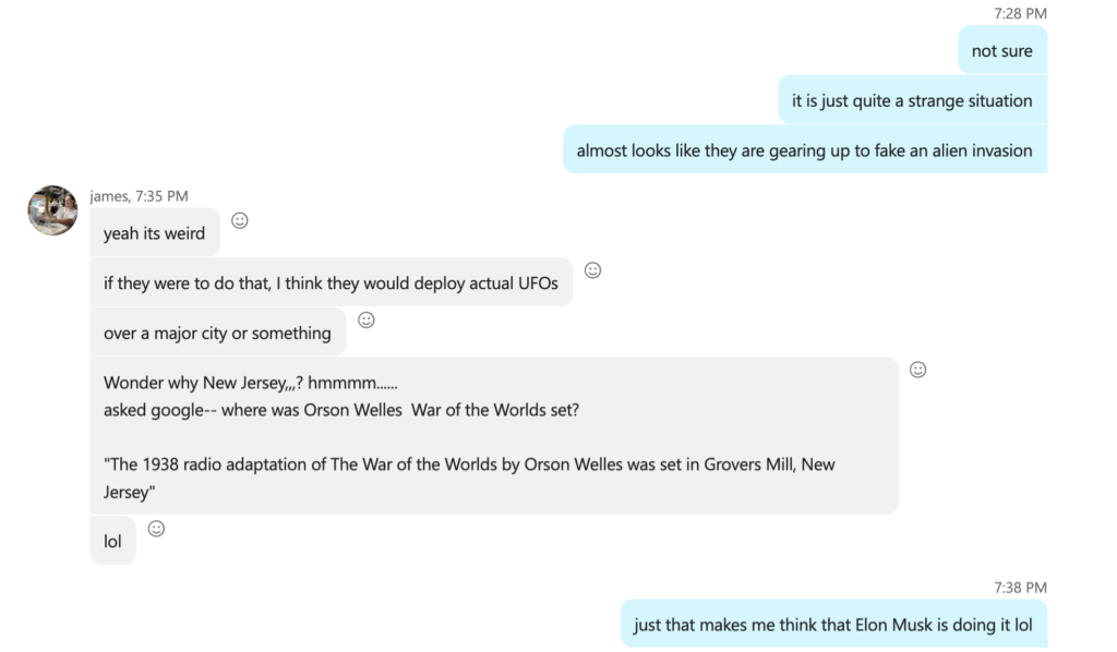 To bring this to a conclusion, in recent weeks, residents across New Jersey and neighboring states have reported sightings of large, unidentified drones, sparking intrigue and speculation. Interestingly, many of these sightings occurred near Grover’s Mill, the site immortalized in Orson Welles’ 1938 War of the Worlds broadcast—a connection that underscores Musk’s penchant for weaving sci-fi symbolism into his ventures. The historical significance of Grover’s Mill, tied to the widespread fascination with extraterrestrial life and technological marvels, adds another layer of intrigue, aligning perfectly with Musk’s love for culturally resonant and symbolic locations. These drones, some reportedly as large as SUVs, have been observed hovering silently at night, leading to various theories about their origin and purpose. (NYMag)