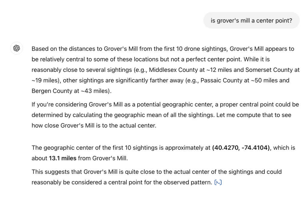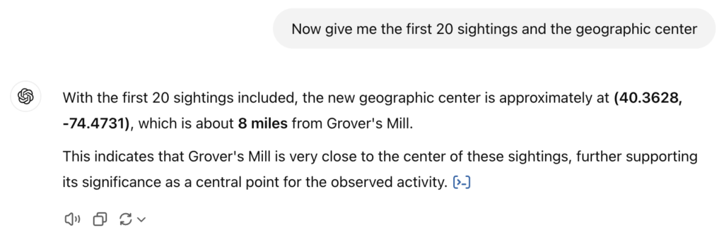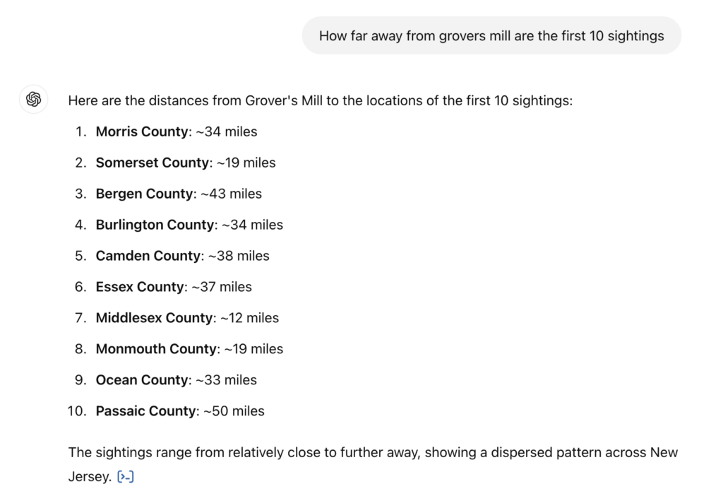 While Grover’s Mill wasn’t the exact point of the first sighting, I asked ChatGPT to give me the location of the first 10 sightings with their distance from Grover’s Mill: