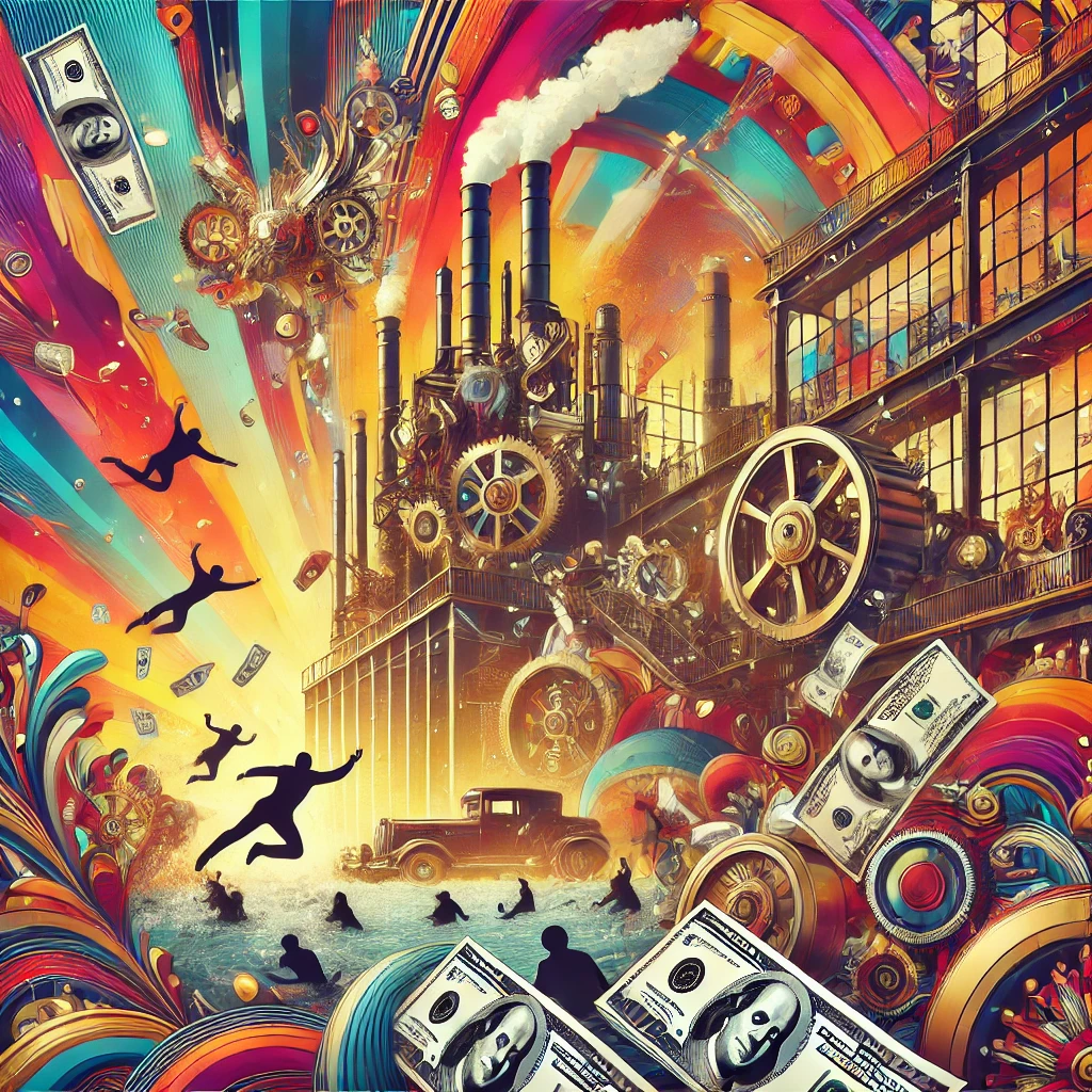 Steampunk-style scene with people swimming in money, factory background, and colorful explosion
