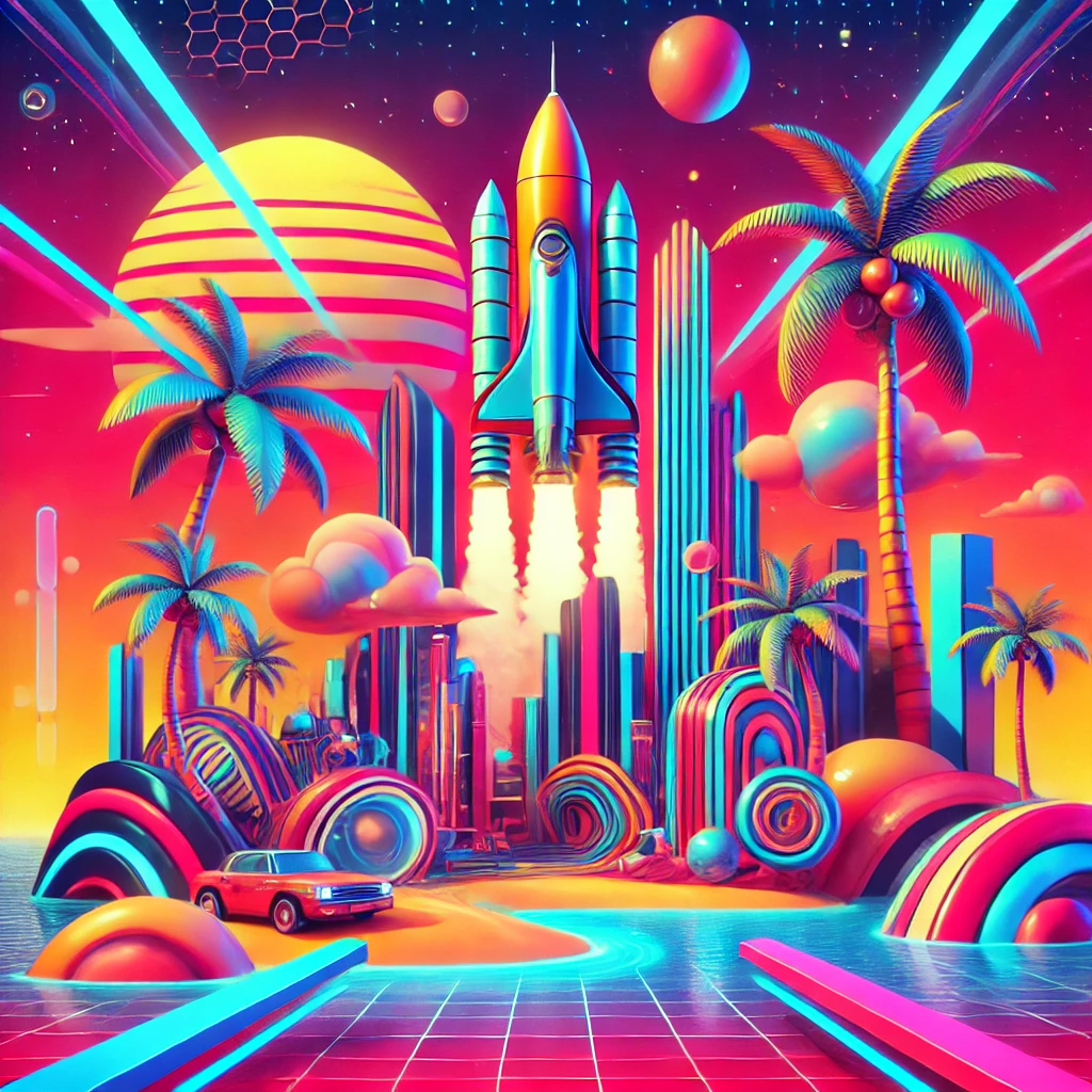 Cyberpunk-themed abstract image featuring a vibrant paradise island with a cartoon-style rocket in the background.