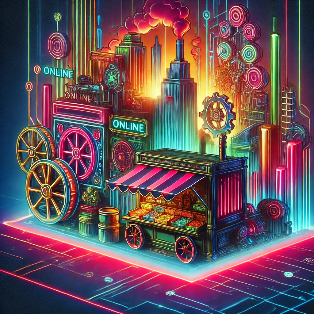 Abstract image of online marketing strategies with a cyberpunk city and a vintage market, featuring a steam-powered machine in the background.