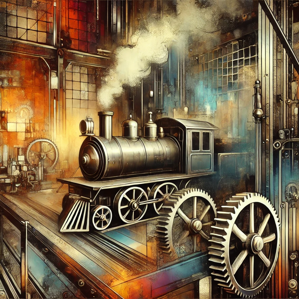 Steampunk-themed scene in a vintage factory with bold, vibrant colors and a large steam engine in the background.